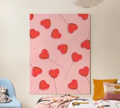 Un vivace mix di caramelle è distribuito su una superficie rosa, che mostra varie forme e colori, tra cui lecca-lecca roteanti e dolciumi rotondi. Questa disposizione giocosa invita a una gioiosa indulgenza.