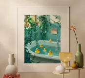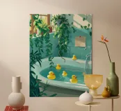 Una stravagante vista dall'alto di una vasca da bagno piena d'acqua con tante paperelle di gomma gialle e brillanti. La scena è giocosa e affascinante ed evoca un senso di nostalgico e semplice divertimento durante il bagno.
