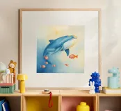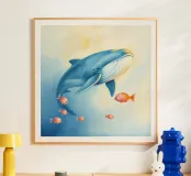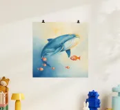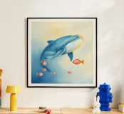 Balena che nuota con piccoli pesci arancioni in una delicata immersione subacquea poster con telaio in alluminio