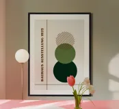 Un poster estremamente minimalista ed elegante, ispirato alla Bauhaus Ausstellung del 1923. Il design è caratterizzato da tre cerchi impilati verticalmente, che creano un'elegante sfumatura di verde che va dal verde oliva medio al verde bosco intenso. Il cerchio superiore aggiunge una texture a strisce di terracotta, in contrasto con le forme solide sottostanti. Questa composizione è una pura incarnazione dei principi dell'astrazione geometrica e del modernismo. Questa arte digitale è fornita in qualità superiore (7000x5000 pixel, 300 dpi), garantendo linee nitide e una ricca tavolozza di colori per la stampa su qualsiasi supporto. È un'opera ideale per aggiungere un tocco sottile e di terra.