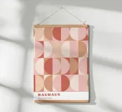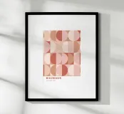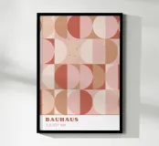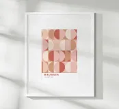 Un manifesto Bauhaus del luglio-settembre 1919, rilassante e sofisticato, caratterizzato da un motivo geometrico dinamico con una moderna texture a terrazzo. Il disegno è un mosaico continuo di cerchi e semicerchi che si alternano su una griglia a scacchiera. La composizione utilizza una tavolozza calda e monocromatica di rosa tenue e polveroso, di rosa fard e di rosso terracotta. La texture del terrazzo maculato è applicata abilmente a varie forme, aggiungendo profondità e un tocco contemporaneo alla classica forma modernista. La parola "BAUHAUS" e la data sono poste semplicemente in basso. Questa stampa digitale ad alta risoluzione (700