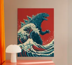 "Immaginate di trovarvi in uno scenario uscito direttamente da un film giapponese retrò: un colossale Godzilla che emerge in una piccola città, sul punto di scatenare il caos. Quest'opera fonde il surrealismo neopop con un tocco di arte digitale vintage. Ispirato ai classici maestri del paesaggio, questo dipinto presenta un ambiente sereno e familiare invaso dalla presenza imponente e inaspettata di Godzilla e da una frase in stile graffiti che può risuonare con lo spettatore."
