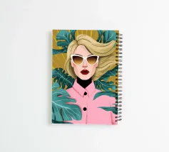 This artwork portrays a person with blonde hair, dressed in a pink shirt, set against a background of green leaves. It evokes calm and beauty.