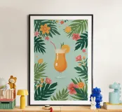 Bevanda all'arancia in bicchiere con fiori e foglie illustrazione poster