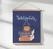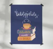 A design for all lovers of books and reading This design celebrates the love for reading with the word "Bibliophile" written in an elegant cutting character. Under an illustration of a pile of three books with the Sentence Adventure Await in Book "adds a touch of adventure and discovery.in general