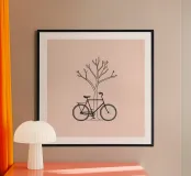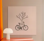 Bicicletta appoggiata a un albero spoglio su uno sfondo muto poster con telaio in legno