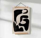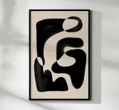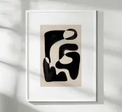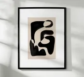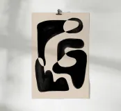 Abstract artwork featuring organic black shapes on a beige background, creating a visually captivating interplay between the positive and negative spaces.