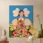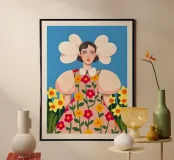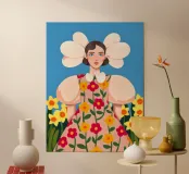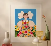 This artwork depicts a person in a dress covered with large, colorful flowers. The background is blue with white clouds, and the person stands amidst a field of flowers, symbolizing growth and beauty.