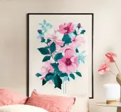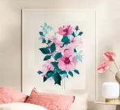 A vibrant and captivating bouquet of pink flowers, beautifully rendered in a contemporary style. The contrasting teal leaves add a touch of sophistication to this stunning floral artwork.