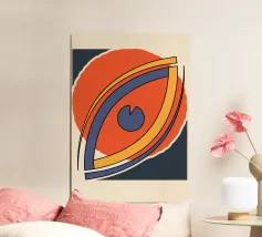 Un'impressionante e moderna stampa d'arte digitale a trittico con tre disegni geometrici astratti unici in un'armoniosa tavolozza di blu navy profondo, blu reale vibrante e giallo senape caldo. I pannelli presentano forti motivi simbolici: il pannello superiore presenta un sole stilizzato con raggi frastagliati; il pannello centrale mostra un occhio astratto all'interno di un grande cuore; il pannello inferiore combina cerchi e una forma di occhio contenente una stella. Questo pezzo fonde con successo i principi geometrici del Bauhaus con un'estetica contemporanea Boho Minimalista. Offerto in un file digitale di qualità superiore (7000x5000 pixel, 300 dpi), garantisce un'espe