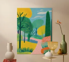 Abstract trees with stylized branches are depicted against a backdrop of muted earth tones. Strong vertical and diagonal lines give the impression of a sparse forest or woodland scene employing a simplified color palette.