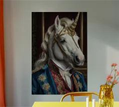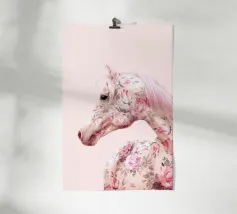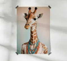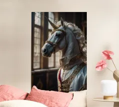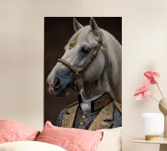 Un'immagine surreale che raffigura una figura umana con la testa di un cavallo, elegantemente avvolta in un tessuto beige strutturato. La composizione trasmette mistero, maestria e un senso di simbolismo ultraterreno, fondendo elementi umani e animali.
