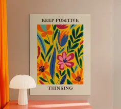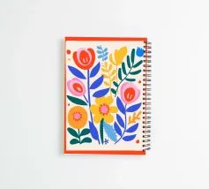 A vibrant array of stylized flowers and leaves is set against a bold red background. Various blossoms in shades of pink, blue, yellow, and red are interspersed with green and blue foliage, creating a lively, cheerful composition.