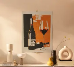 Due bottiglie di vino, un bicchiere di vino rosso e uva fresca su uno sfondo di foglie di vite verdi: questa classica natura morta è un omaggio al piacere, all'artigianato e alla natura. I colori tenui e la rappresentazione realistica rendono il motivo particolarmente adatto a cucine, sale da pranzo o cantine. Ideale per gli amanti del vino, i sommelier o come regalo per gli intenditori.