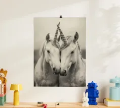 Un'immagine surreale in bianco e nero di una donna in abito di pizzo che si trova di fronte a una gigantesca testa di cavallo con texture screpolate, che crea un'atmosfera onirica e stimolante in un cielo nuvoloso.