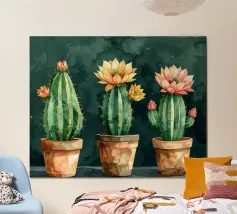 This cheerful poster features cute cactus plants in full bloom, set against a soft pink background that enhances its playful, feminine charm. Bright blossoms and rounded forms create a lighthearted, happy composition with a warm, uplifting feel. Its sweet, modern aesthetic makes it especially well suited for bedrooms, nurseries, home offices, and creative spaces, adding a touch of joy, color, and cute botanical style.