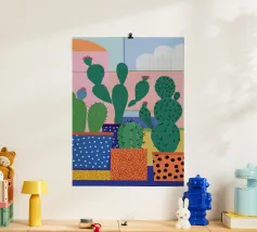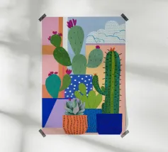 Un'illustrazione divertente e stravagante presenta un cactus rosa che indossa un piccolo cappello giallo, creando un personaggio affascinante e stravagante pieno di personalità.