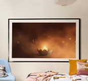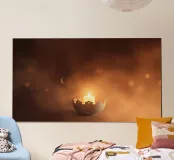 Candela a luce soffusa in un supporto ornato, circondata da un ciuffo di foglie. poster con telaio in legno