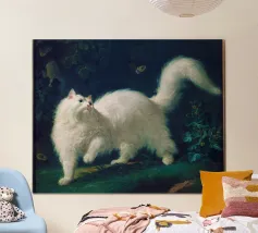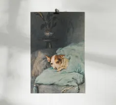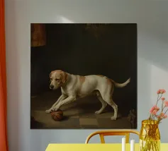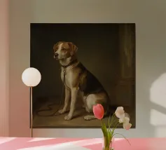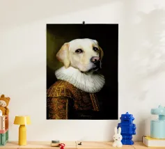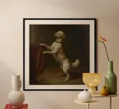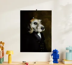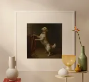 Cane in piedi con le zampe su un tavolo in un ambiente classico poster