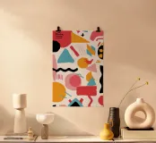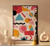 Una composizione astratta caotica e divertente in stile Memphis, con un assortimento casuale di forme geometriche, ghirigori e motivi. L'opera d'arte è energica, giocosa e ha una fresca atmosfera retrò.