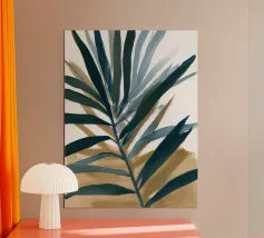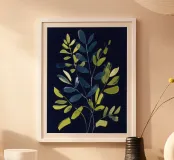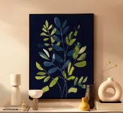 A luminous botanical abstraction featuring vivid green and teal leaves set against a deep midnight background. The interplay of color and brushstroke gives the composition an ethereal, glowing quality—like foliage illuminated under moonlight. Both vibrant and serene, this modern piece bridges organic motion with bold minimalism.