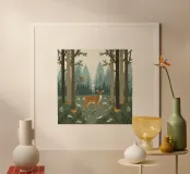cervo circondato da uccelli e conigli nella foresta poster con telaio in alluminio