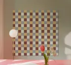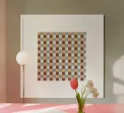 Un motivo di quadrati colorati alternati crea un effetto scacchiera con sfumature di beige, grigio e marrone. Il disegno a griglia è simmetrico e uniforme.