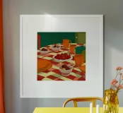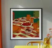 A dinner table scene with a red and white checkered tablecloth, set with bowls of food and orange cups. The perspective and colors create a cozy, communal feeling.