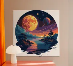 Si apre un paesaggio ipnotico, dove cime imponenti trafiggono un cielo pieno di sfere di luce. La scena è un tripudio di colori, con sfumature di arancio, rosa, blu e viola che si fondono senza soluzione di continuità. L'uso di linee spigolose e taglienti accostate a forme morbide e arrotondate crea una tensione visiva accattivante. Un fiume tranquillo si snoda nella valle, riflettendo i colori vibranti che la sovrastano. Quest'opera invita lo spettatore a esplorare un mondo in cui colore e forma danzano in perfetta armonia.