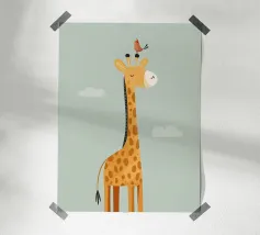 Un'illustrazione giocosa e sognante di un'alta giraffa che si erge su un cielo stravagante pieno di nuvole morbide e colorate. La palette di colori retro-moderni in rossi caldi, gialli e crema crea un'atmosfera serena e fantasiosa, perfetta per la stanza dei bambini o per uno spazio di lavoro creativo. Stampato in alta risoluzione per garantire dettagli e impatto visivo sorprendenti.