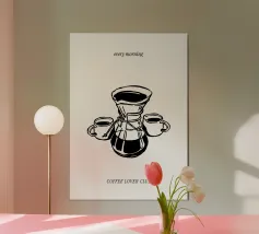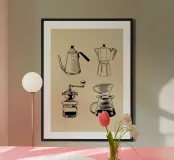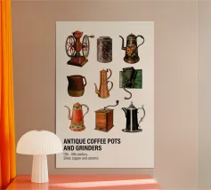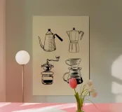 Un disegno minimalista mostra quattro strumenti vintage per la preparazione del caffè: un bollitore a collo d'oca, una caffettiera moka, un macinacaffè a manovella e un gocciolatore. Ogni strumento è illustrato con linee dettagliate su uno sfondo beige.