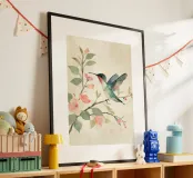 Colibrì appollaiato su un ramo in fiore con una delicata colorazione rosa poster