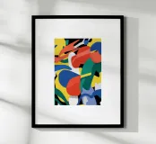 Un'energica opera d'arte astratta in cui forme audaci nei colori primari del rosso, del blu e del giallo si scontrano e si sovrappongono. La composizione è dinamica e giocosa, con un forte impatto grafico che ricorda i maestri moderni.