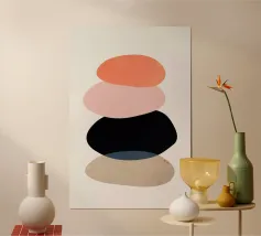 Tre aree ovali di colore rosa, giallo e arancione formano una composizione calma ed equilibrata. Il poster moderno ha un aspetto amichevole, leggero e strutturato allo stesso tempo - perfetto per gli interni con un linguaggio di design chiaro e un effetto cromatico positivo. Ideale per gli studi creativi, i soggiorni o come elemento di spicco in ambienti minimalisti.