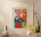 A composition featuring bold geometric shapes and vivid colors forms an abstract mosaic. Elements like circles, triangles, and a blue whale create an intriguing visual balance within the rectangular layout.