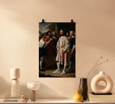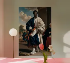 "Cool King porta la regalità a un livello completamente nuovo. Questo intelligente collage neopop reimmagina i classici ritratti reali con un tocco di ironia e molto surrealismo. Sfoggiando l'ultima moda urbana, questo monarca umoristico non è solo pronto a governare il suo regno, ma anche la scena della moda urbana!".