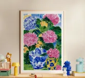 A still life of a blue and white faceted vase filled with pink and blue hydrangeas and other flowers, against a dark, patterned floral background.