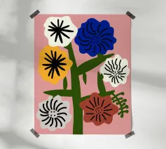 Questo vivace disegno floreale combina colori vivaci e forme moderne: Fiori rossi e blu con un centro giallo solare su un allegro sfondo rosa e giallo. Un motivo fresco ed elegante che unisce il fascino retrò degli anni '70 alla chiarezza scandinava. Perfetto come murale, tazza, cuscino o cover per cellulare, per gli amanti dei motivi floreali colorati, delle decorazioni di metà secolo e degli accessori moderni per la casa. Un richiamo ideale per il soggiorno, la camera da letto o l'ufficio e un regalo affascinante per gli amanti dell'arte e dei fiori.