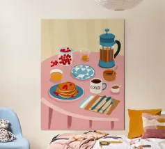 Illustrazione luminosa e allegra di un tavolo per la colazione illuminato dal sole, con caffè, succo d'arancia e pasticcini su un vivace sfondo giallo.