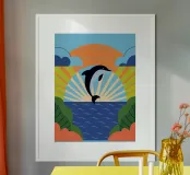 Enjoy a vibrant ocean illustration featuring a dolphin leaping in front of a colorful sunset. With bold colors and a unique design, this artwork will bring a touch of the sea and artistic flair to your space.