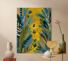 Una scena autunnale con una giovane donna che cammina lungo un sentiero che attraversa una colorata foresta autunnale. Lo sfondo è di un vivace azzurro cielo, che crea un contrasto deciso con le tonalità calde delle foglie e del fogliame autunnale. La donna indossa uno spesso maglione marrone, una sciarpa giallo senape avvolta attorno al collo e pantaloni a righe verticali arancioni, gialle e bianche che riprendono le tonalità autunnali circostanti.