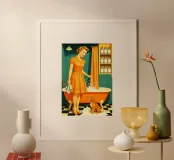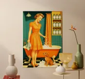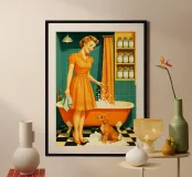 Donna con cucciolo in bagno poster