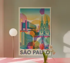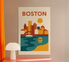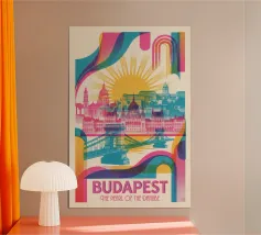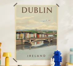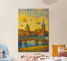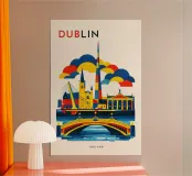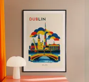 A bold, graphic celebration of Dublin, captured through clean geometry and vibrant colour blocking. Iconic landmarks line the river in layered harmony, with strong silhouettes and rhythmic shapes creating a sense of movement and balance. The composition feels lively yet grounded, reflecting Dublin’s blend of history, culture, and contemporary energy.