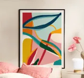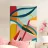 A dynamic and harmonious abstract composition features flowing lines and shapes in a palette of teal, orange, pink, and white, creating a sense of balanced and elegant movement.