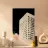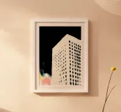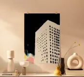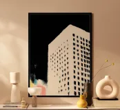 Semplice illustrazione risografica di un edificio bianco su sfondo nero. Linee e forme minimaliste, combinate con accenti di colore in rosa chiaro e beige scuro. Miscela di aspetto acquerellato, stampe a blocchi audaci ed effetti di tavolozza testurizzata.
