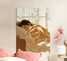 This artwork captures an intimate moment of rest through a restrained, painterly digital style. Deep emerald tones envelop the sleeping figure, creating a cocoon of calm and protection. The soft contrast between the pale face and the dark, textured surroundings emphasizes vulnerability and peace. Layered brushstrokes and simplified forms blur the boundary between body and environment, suggesting surrender to stillness. The composition evokes silence, warmth, and emotional refuge, transforming sleep into a quiet act of introspection and renewal.