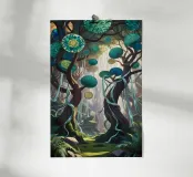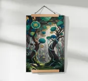 A mystical forest scene with intricate, colorful plates suspended from ancient trees. This vibrant artwork evokes a sense of wonder and tranquility.