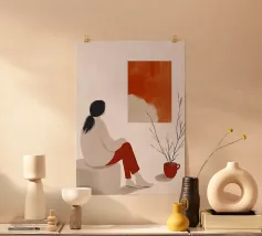 Una composizione di stile di vita minimalista in cui una figura solitaria riposa in un ampio campo di calde tonalità di pesca e terracotta. Le texture morbide e le forme contenute evocano spaziosità, chiarezza e autosufficienza emotiva. Quest'opera d'arte parla del comfort della solitudine e della forza tranquilla che si trova nell'avere spazio per respirare, pensare e semplicemente essere. Un pezzo sereno e fondamentale per interni moderni, scandinavi o contemplativi.