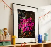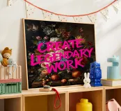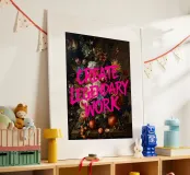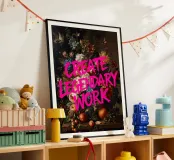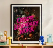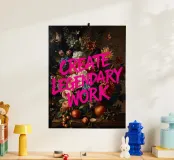 L'immagine raffigura una natura morta di una lussureggiante composizione floreale con frutti, cui si sovrappone il testo "CREATE LEGENDARY WORK" in rosa acceso. I fiori comprendono rose, dalie e altre fioriture nei toni del bianco, del rosa, del blu e dell'arancio. Alla base del vaso sono disposti frutti come mele, arance e piccole bacche. Le farfalle volteggiano intorno ai fiori, aggiungendo un tocco di estrosità.