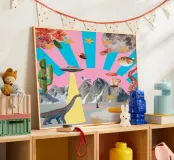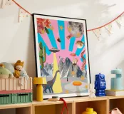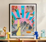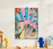 La follia colorata e il caos del collage. Ogni cosa casuale in un'immagine, con un tocco di grafica retrò. Dinosauri, alieni, polpi, funghi, pesci palla, uova fritte, montagne, lampioni, luna, biglietti del cinema, ecc.